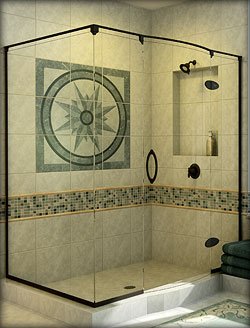 Basco Preceria Frameless Shower Door 1952-KK-BB. 74''x 60"x48", Silk Panels, Door remains Clear Glass, Brushed Bronze, Glass Detail